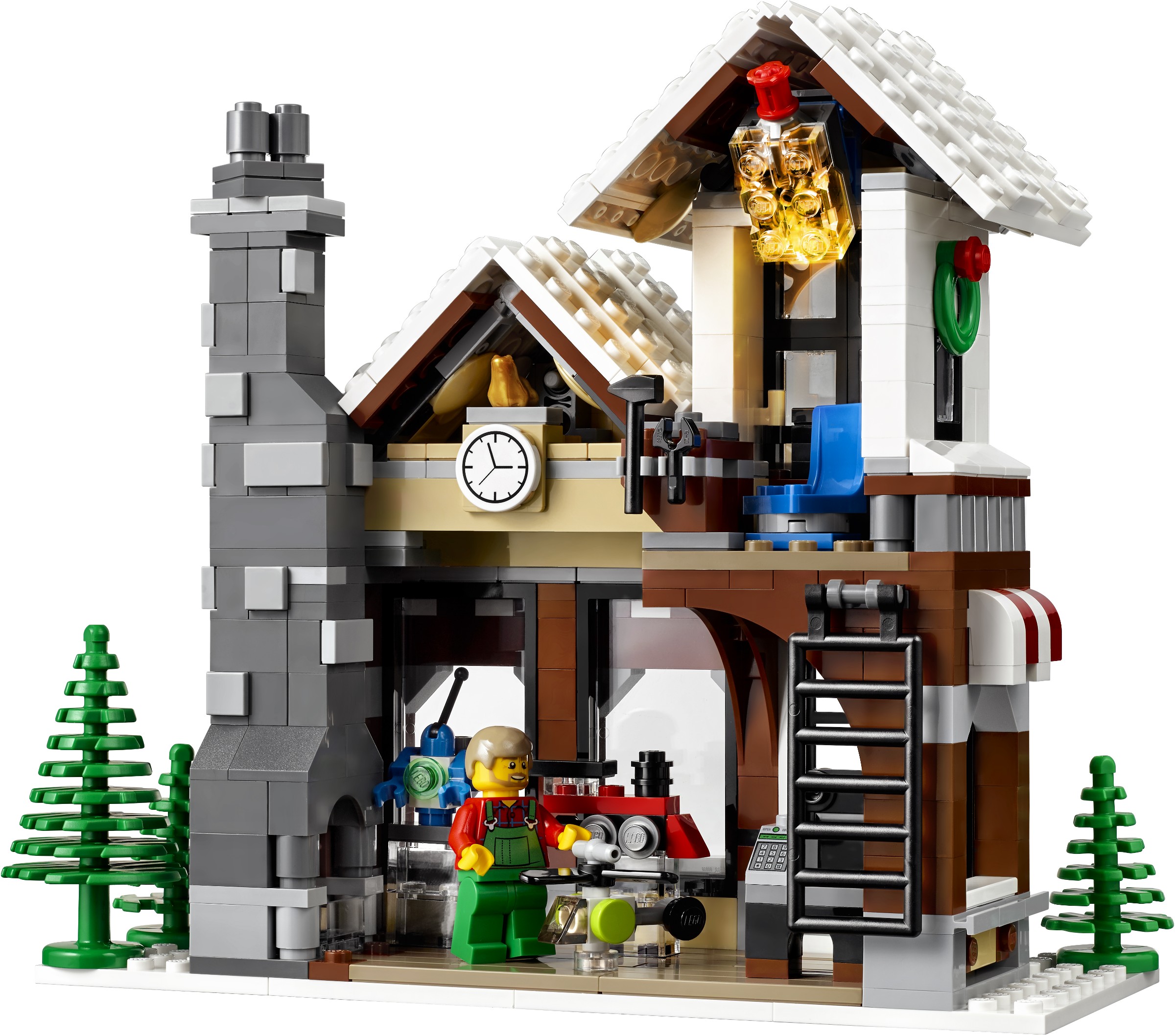 Welcome to the Winter Toy Shop! The holiday season has arrived and the toymaker is busy finishing off his latest creations! Outside, children ski and snowboard, and a freshly built snowman sparkles in the light that shines from the toyshop tower. Help decorate the huge tree that stands at the center of the square, play with the curious kitten on the cozy wooden bench or join in with the carolers beneath the ornate streetlamp. This charming set also features a ladder, trees in various sizes, jack-in-the-box, a toy biplane, helicopter, rocket, train, race car, truck, robot, tugboat, teddy bear and a wrapped gift. Have fun building this enchanting winter wonderland! Includes a snowman and 8 minifigures with assorted accessories: a male caroler, female caroler, a woman, 2 men, 2 boys and a girl.