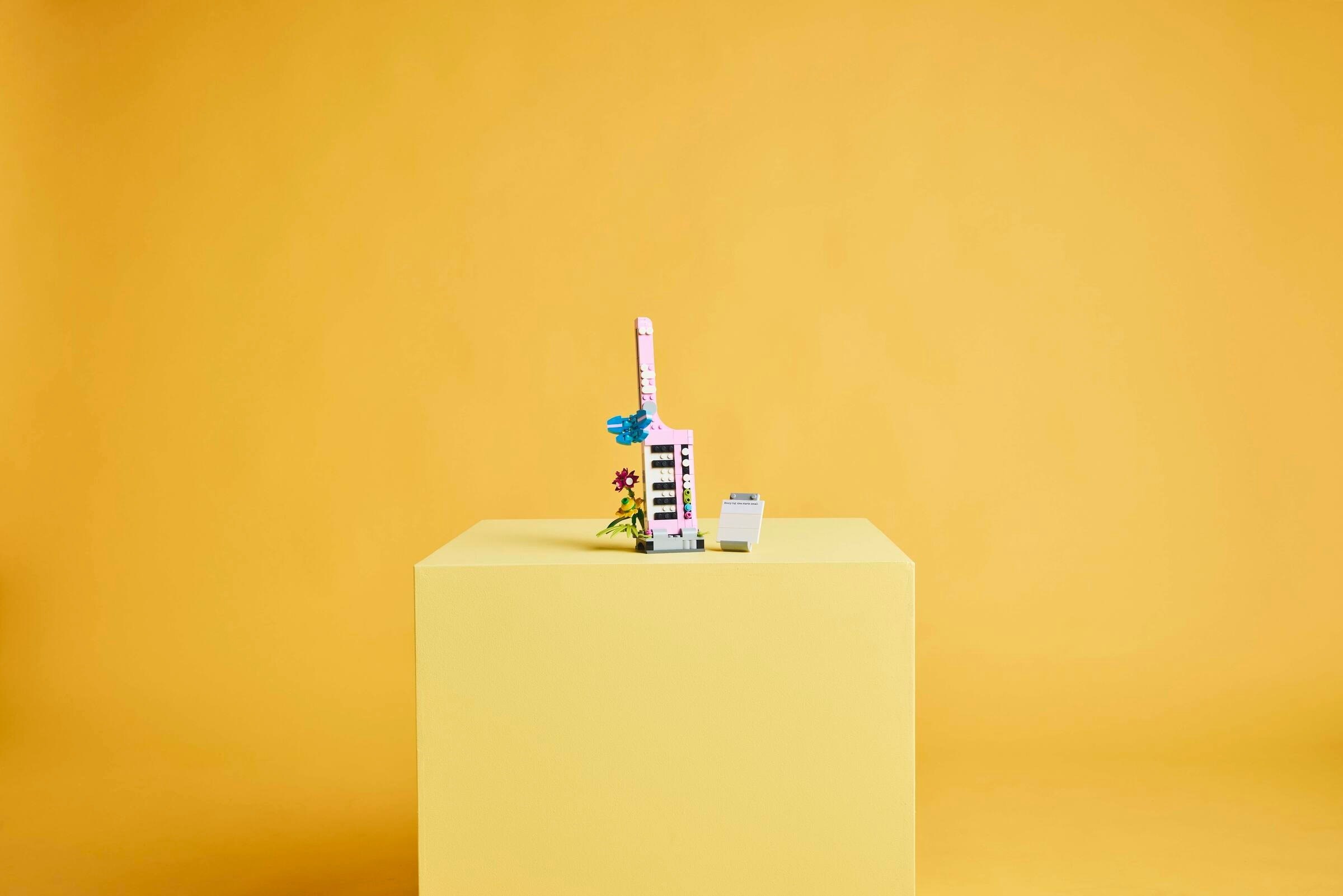 LEGO fans have a choice of 3 different flower kits to build: a Typewriter with Flowers toy; a keytar toy instrument on a stand with flowers; or a flowerpot with a pen and notebook. The rebuildable toy playset also comes with 3 stickers featuring thoughtful phrases, which kids can use to decorate the brick-built models.