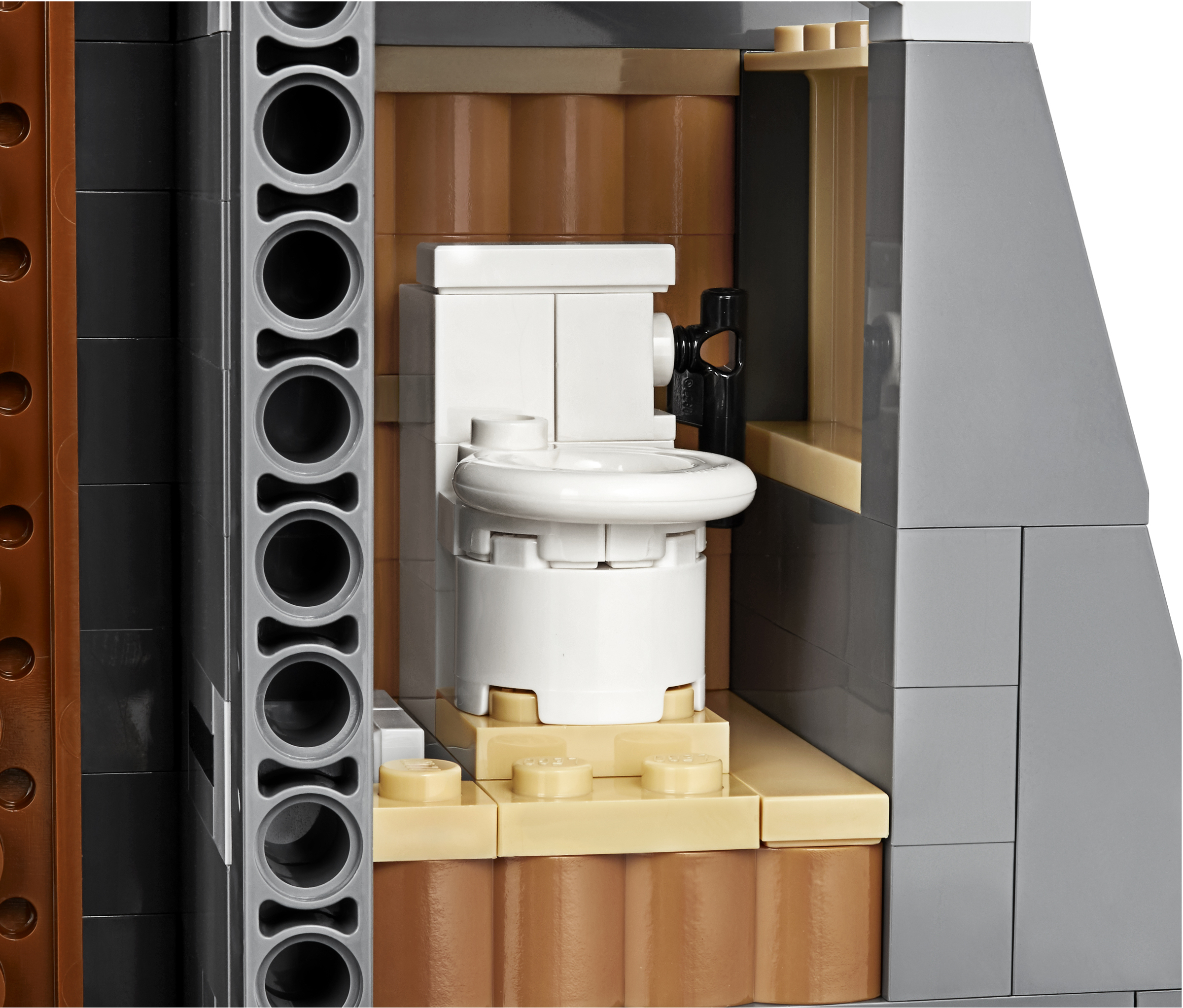 - The wall framing the gate features a buildable dinosaur nest with 2 cracked egg elements at the top and other brick-built scenes inspired by the movie, including: a bunker with a buildable bed for Ian Malcolm, flashlight and fire extinguisher, plus ladder and display case elements; power shed for scene with Ellie Sattler; John Hammond’s dining room with table and minifigure chair, plus ice cream, spoon and 3 cookie elements; Ray Arnold’s control room with a buildable desk, 3 computers and a minifigure chair; scene with a buildable bathroom; scene for Dennis Nedry with a buildable mud slide and shaving cream can.
